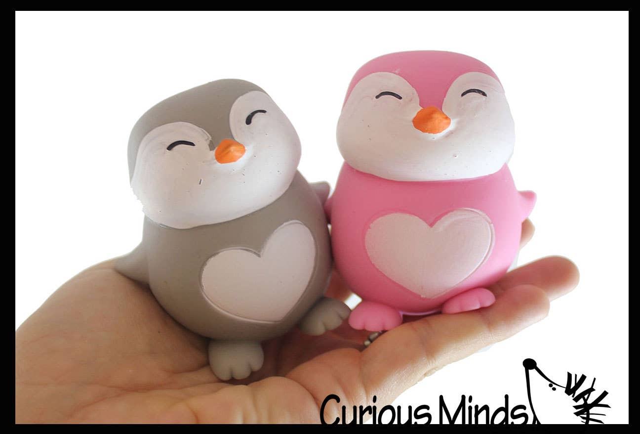 INCLUDES 1 RANDOM COLOR - IN BOX - These animals are so soothing and addicting to squish. These are so soft that it is difficult to describe how great they are. The best I can do is imagine you just made your own bread doh or kids doh to play with. It feels like that. When you squish it, it dents in then slowly expands back to its original shape. The skin on the animals are also soft and stretchy, and not sticky. These penguins come in 4 colors: Pink, grey, blue, and black. Balls are 2.5" x 2".