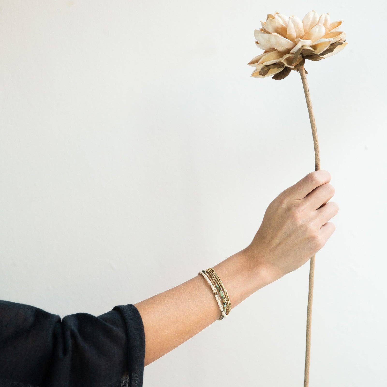 Faceted gemstones mix with tiny geometric metal beads to create a subtle and magical piece. Wraps as a bracelet 3 times or wear as a single strand necklace.