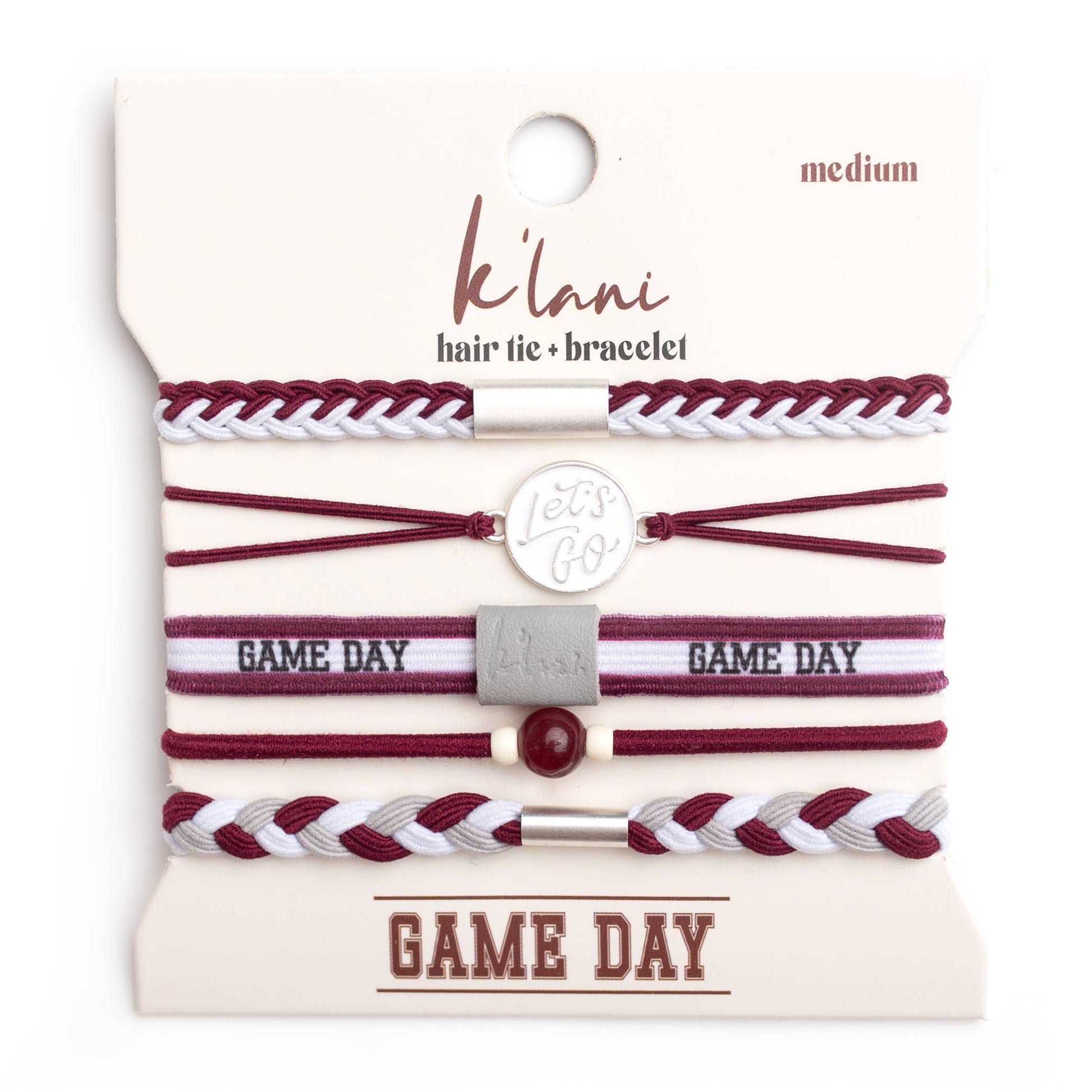 This Game Day set is made to show your school spirit with style and pride. These 5 hair tie bracelets feature bold team colors of Maroon and Gray and are perfect for cheering from the sidelines or celebrating a win. With a “Let’s Go” charm and a natural stone bead accent, this set is a fun way to support your team and wear your pride on your wrist while ready to pull your hair up when the games gets intense.