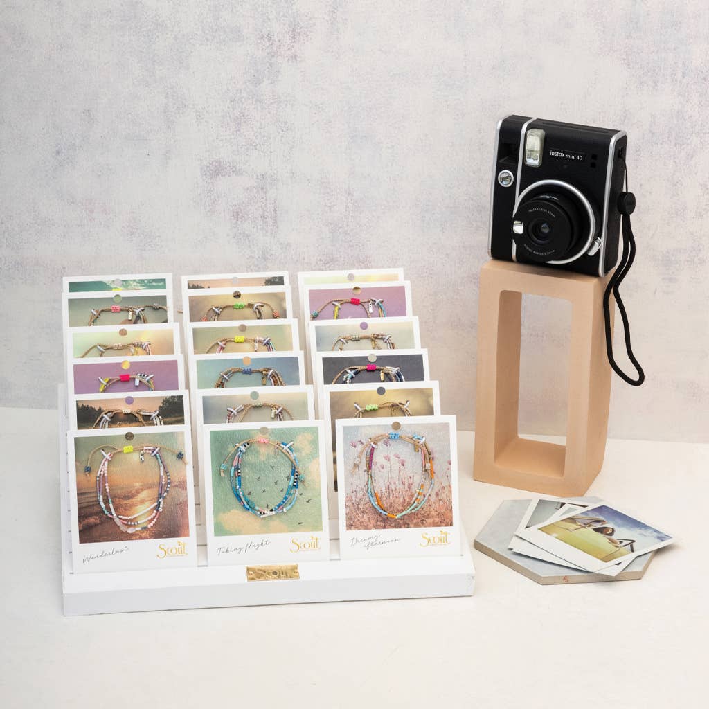 The semi-precious stone and its meaning are highlighted on the back of each card and connect to the photograph on the front of the card. Each playful stacking bracelet incorporates semi-precious stones along with Japanese glass Miyuki beads.